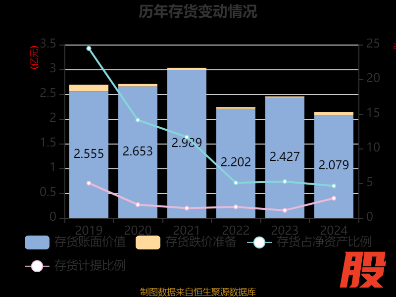 从存货变动来看,截至2024年末,公司存货账面价值为2.08亿元,占净资产的4.6%,较上年末减少3478.19万元。其中,存货跌价准备为603.13万元,计提比例为2.82%。