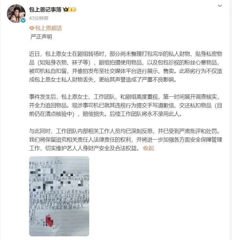 最近包上恩工作室发声明称,艺人在剧组转场期间的私人物品被司机私自扣留,并在社交平台展示、售卖,物品包括贴身衣物、袜子、粉丝礼物及剧组用品。声明附上司机提交的手写道歉信,其中也提及对方赔偿损失,最后强调团队永不录用这个司机。相关话题立刻登上热搜引起网友热议,不少人都支持她保护隐私强调得追责到人。