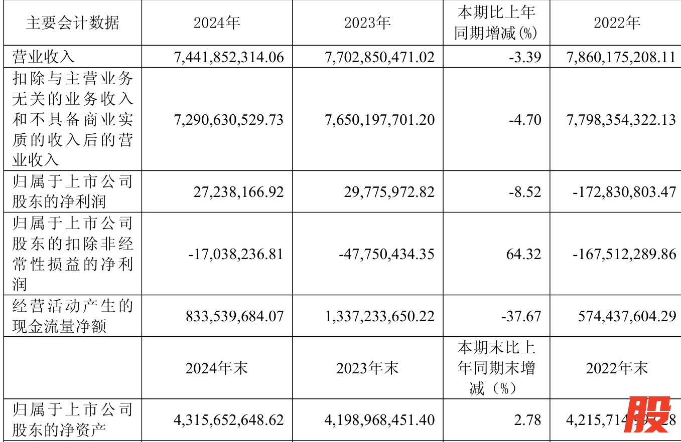 中证智能财讯利群股份(601366)4月25日披露2024年年度报告。2024年,公司实现营业总收入74.42亿元,同比下降3.39%;归母净利润2723.82万元,同比下降8.52%;扣非净利润亏损1703.82万元,上年同期亏损4775.04万元;经营活动产生的现金流量净额为8.34亿元,同比下降37.67%;报告期内,利群股份基本每股收益为0.03元,加权平均净资产收益率为0.64%。公司2024年度分配预案为:拟向全体股东每10股派现0.2元(含税)。