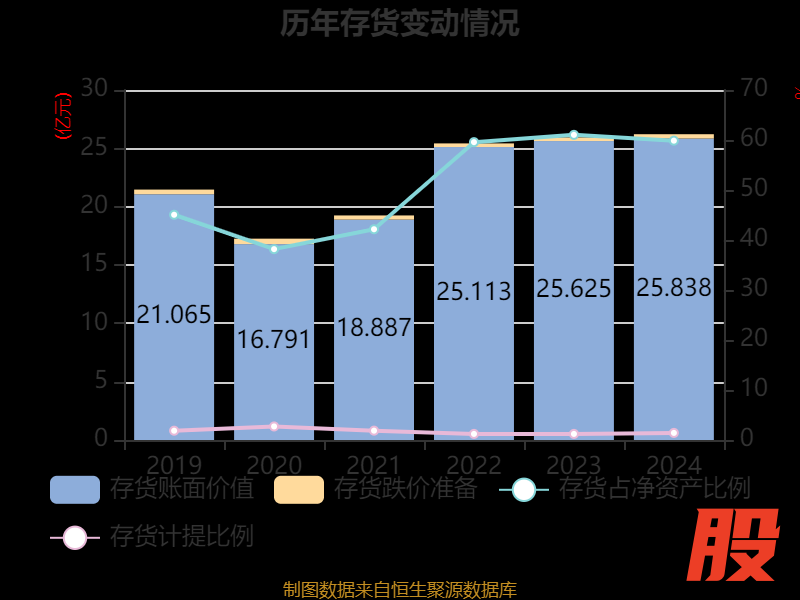 从存货变动来看,截至2024年末,公司存货账面价值为25.84亿元,占净资产的59.87%,较上年末增加2135.74万元。其中宏图配资,存货跌价准备为3715.01万元,计提比例为1.42%。