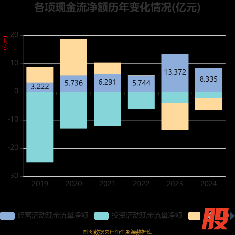 截至2024年,公司经营活动现金流净额为8.34亿元,同比下降37.67%;筹资活动现金流净额-4.25亿元,同比增加5.33亿元;投资活动现金流净额-2.22亿元,上年同期为-3.98亿元。