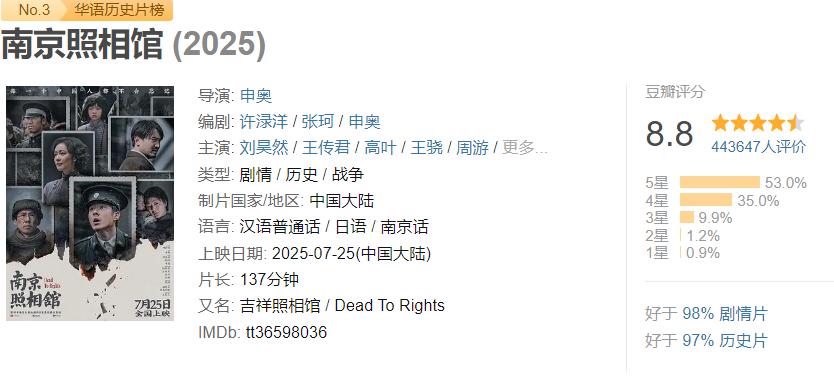 此外,该片在平台上的评分也非常高,达到了9.3分,同样也超过了《哪吒2》。所以说《南京照相馆》的成功并非偶然,而是它拥有真正的实力。
