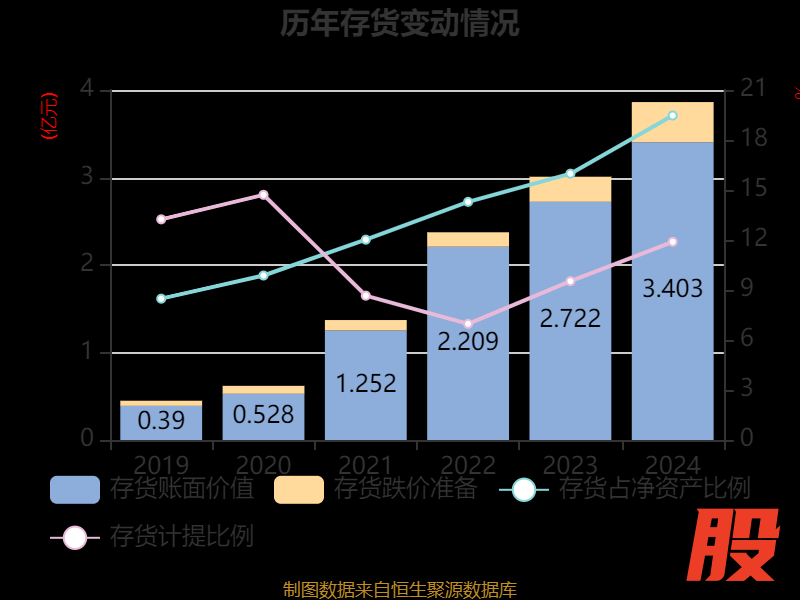 从存货变动来看,截至2024年末,公司存货账面价值为3.4亿元,占净资产的19.47%,较上年末增加6816.36万元。其中,存货跌价准备为4592.56万元,计提比例为11.89%。