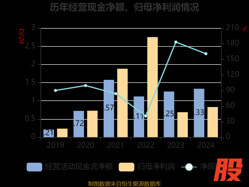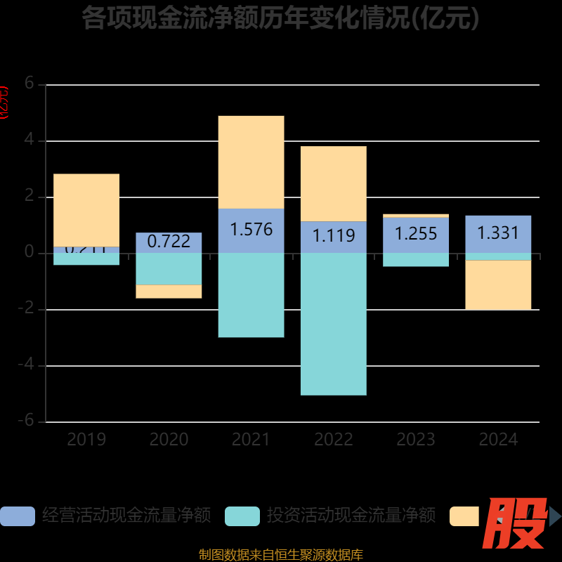 截至2024年,公司经营活动现金流净额为1.33亿元,同比增长5.99%;筹资活动现金流净额-1.76亿元,同比减少1.88亿元;投资活动现金流净额-2580.13万元,上年同期为-4857.09万元。